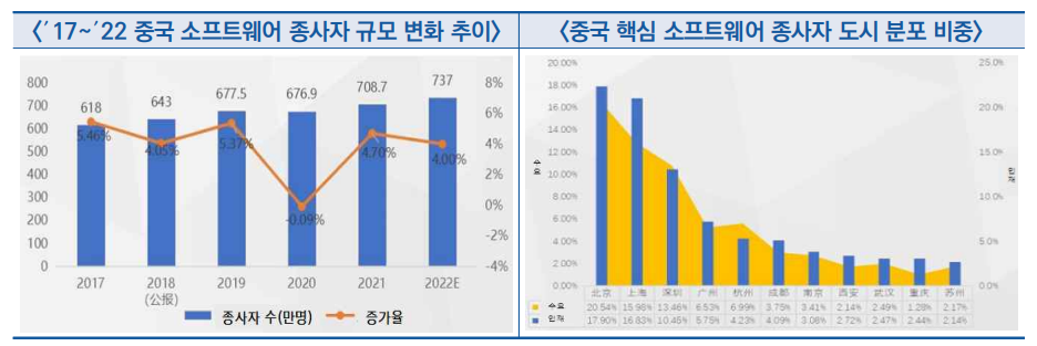 □ 중국의 소프트웨어 인력 규모는 737만 명, 이중 핵심 소프트웨어 인력은 245만 명 수준(8.22)