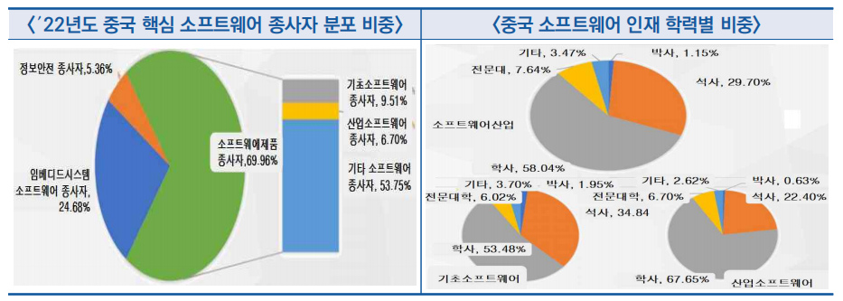 ![]() - 인재 구조를 보면 기초소프트웨어, 산업소프트웨어, 산업응용소프트웨어, 임베디드식 소프트웨어, 신형 플랫폼 소프트웨어 등 5대 핵심 소프트웨어 분야 인력 규모가 245만 명을 차지하고, 전체 소프트웨어 인력 중 석박사 비중은 30.85% 수준