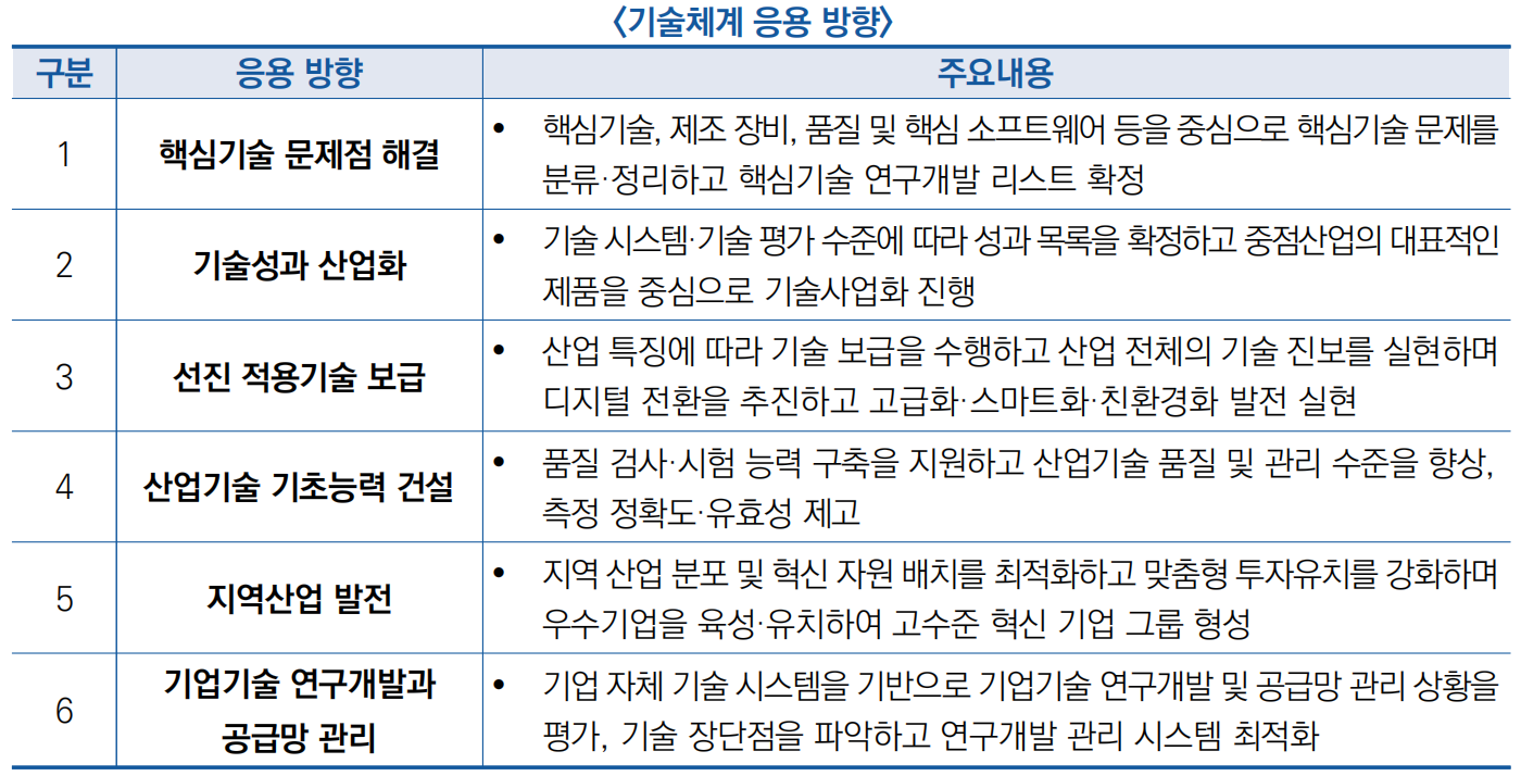 - (기본원칙) 산업별 제품 수명주기를 중심으로 기술체계 발전 및 핵심기술 문제점 분석, 선두기업 주도로 산학연 협력 강화, 지방정부의 특색산업기술체계 건설, 정기적 모니터링 기술체계 구축