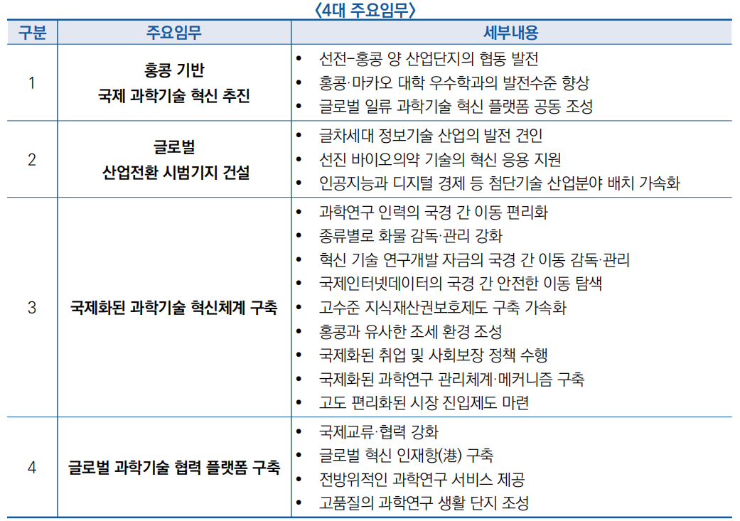 ○ 주요 내용으로 홍콩 기반 국제 과학기술 혁신 추진, 글로벌 산업전환 시범기지 건설 등 4대 주요임무 제시