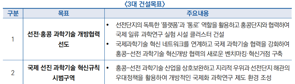 - ′35년까지 홍콩단지와의 협동 혁신 구도를 기반으로 과학기술 혁신 글로벌 수준을 세계적 선두로 제고