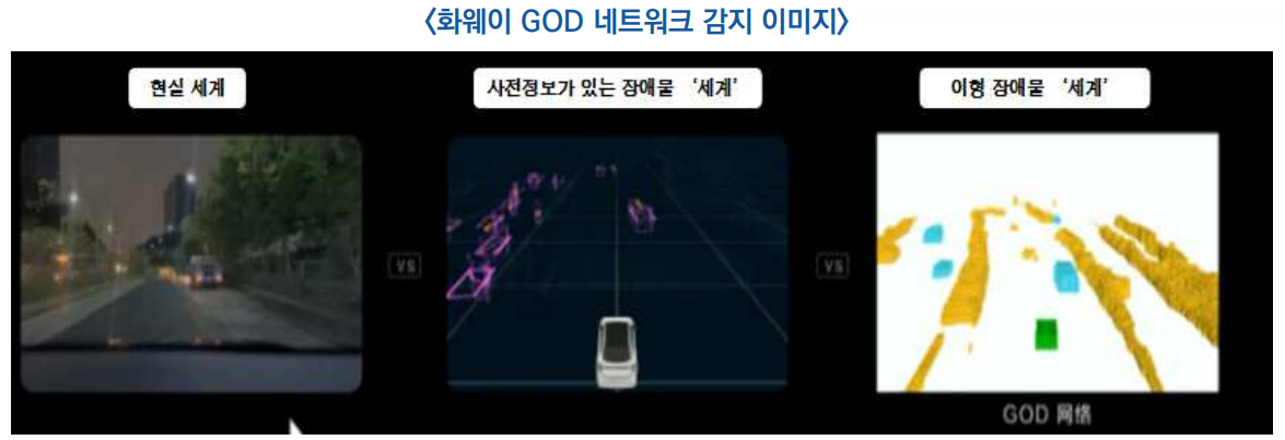 - 카메라, 밀리파 레이더, 레이저 레이더 등의 신호를 융합하여 자기지도학습(SSL)이 가능하여 행인, 차량 등 상규적인 물체 외에도 사전 정보가 없는 이형 장애물도 주도적으로 감지 가능