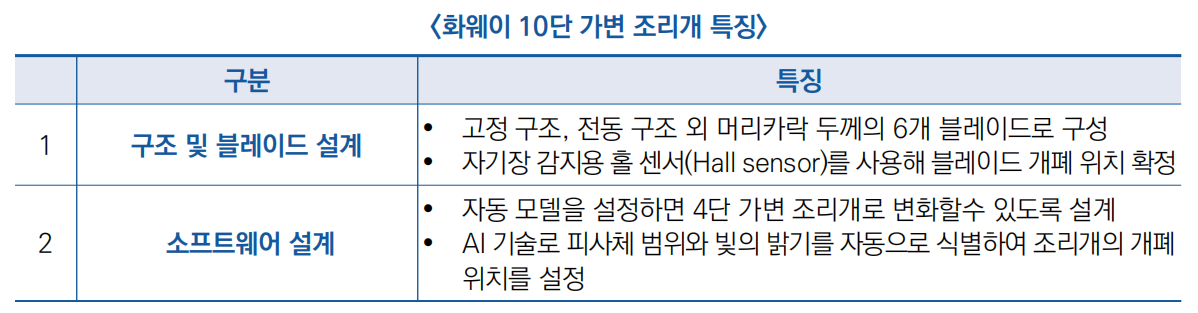 ○ 최근 화웨이는 ‘2023 혁신 및 지재권 포럼’에서 5.5G, HDR·오디오 Vivid, 10단 가변 조리개, GOD(General Obstacle Detection) 네트워크 및 운영 알고리즘 등 5대 혁신 기술을 소개