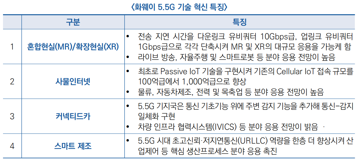 - 화웨이의 5.5G 기술은 기존의 5G 기초위에 업링크 중심 광대역 통신(UCBC), 실시간 광대역 통신(RTBC), 조화로운 통신 및 센싱(HCS) 등 3대 응용 확대