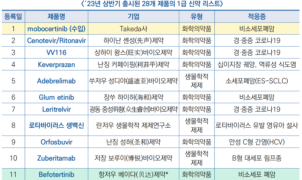 - 중국은 화학의약품 19개 제품(14종), 생물학적 제제 8개 제품(5종) 및 중약 신약 1개를 포함하여 총 28개 제품(20종)의 혁신 의약품 의약품을 출시