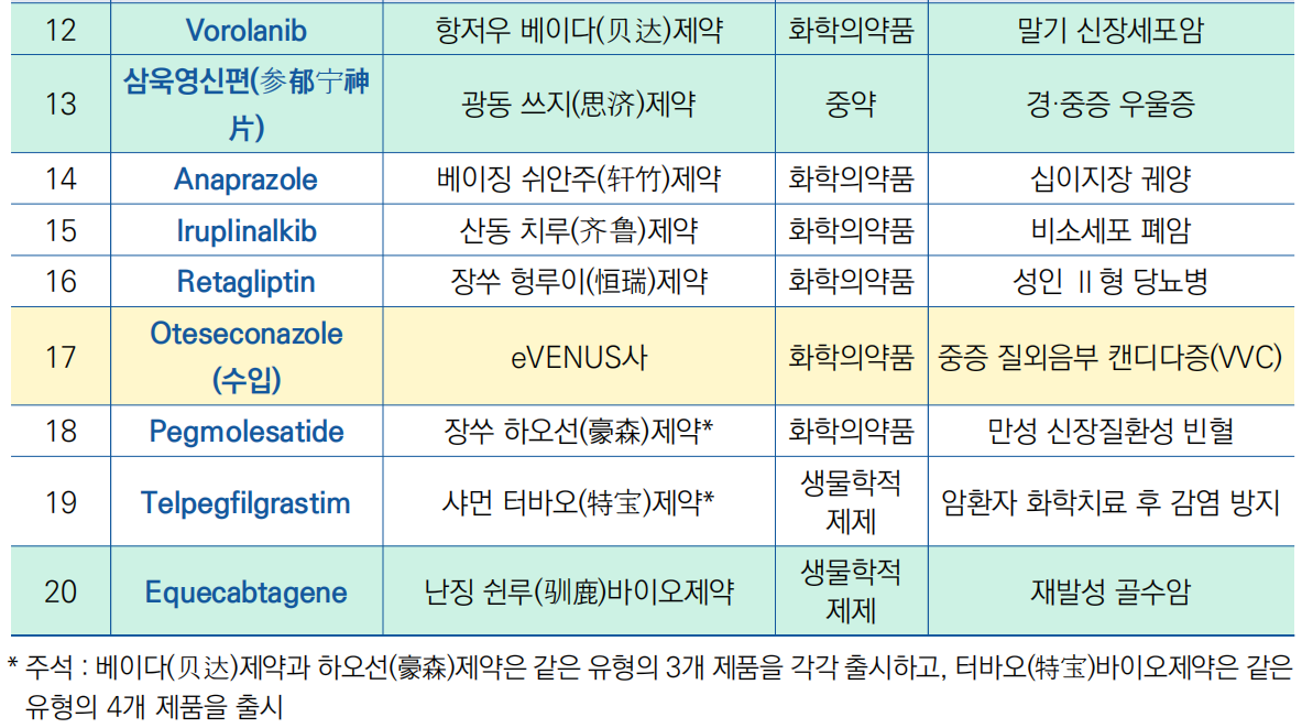 - 그 외 미국의 Takeda, eVENUS 등 해외 기업이 중국시장에서 2종의 화학의약품이 승인됨