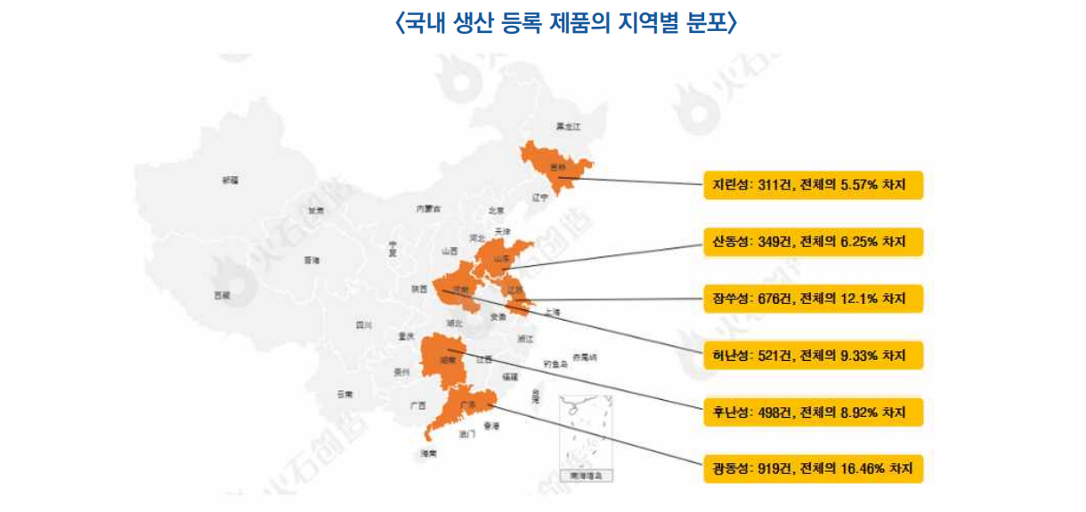 ![]() ![]() ○ 지역적 분포를 보면, 국내 생산 등록 제품(Ⅰ,Ⅱ,Ⅲ급)에 대한 가장 많은 승인은 광동성(919건), 장쑤성(676건), 허난성(521건)으로 나타남