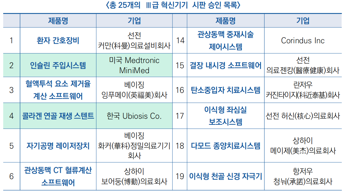 - 총 25개 승인된 의료기기 중 미국, 한국, 캐나다 등 해외 의료기기업은 인슐린 주입시스템, 콜라겐 연골 재생 스텐트, 인공수정체, 혈관내 영상설비 등 기기를 출시