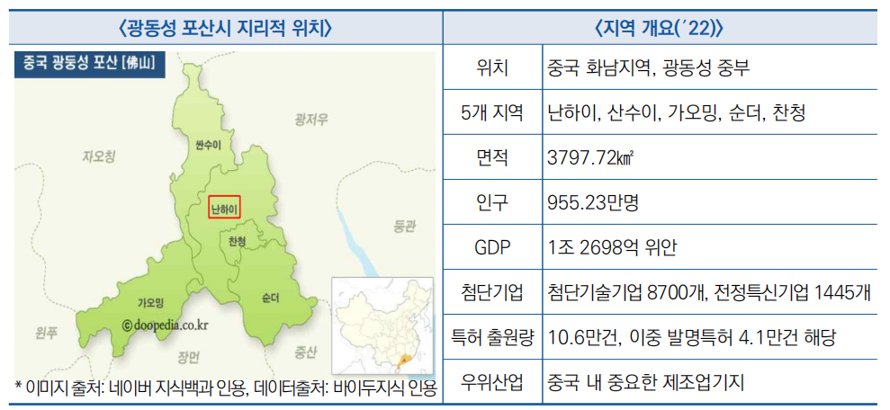 - 중국 수소에너지 산업의 중심인 포산시 난하이구는 ‘22년 기준 신에너지 자동차 생산량이 8만 대에 이르고, 순수전기차와 수소에너지 기반 신에너지 산업생산가치가 441억 위안에 달함