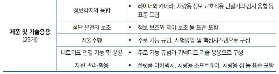 ![]() ![]() ○ 표준체계 내용 중 제품 및 기술응용은 주로 정보감지 및 통합, 첨단 운전 지원, 자율주행 등 스마트커넥티드카 핵심제품과 기술응용의 기능, 해당 테스트 방법을 포괄