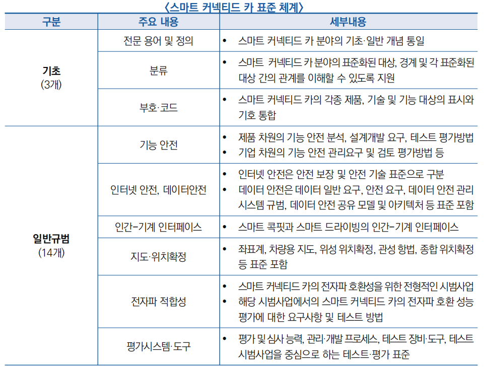 - 자원 관리 및 응용 표준은 플랫폼 아키텍처, 차량용 소프트웨어 및 차량용 칩과 같은 스마트 커넥티드 카의 핵심·공동성 자원의 기능, 성능 및 응용 요구사항의 표준화