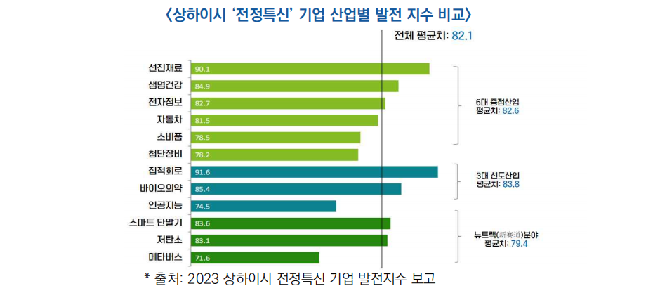 - 상하이시 ‘전정특신’ 기업 발전 지수의 평균치는 82.1이며 3대 선도산업, 6대 중점산업과 뉴트랙 분야의 평균치는 각각 82.6, 83.8과 79.4수준임