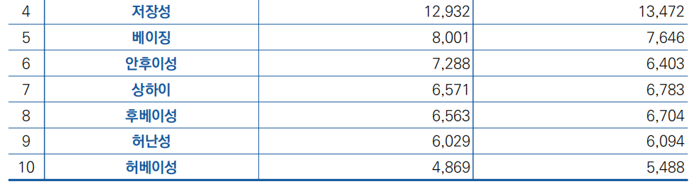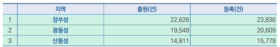 - 장쑤성은 녹색기술 특허 출원량 2만 2626건과 등록량 2만 3836건으로 중국 전체 1위를 차지하고, 광동성과 산동성이 2,3위를 차지