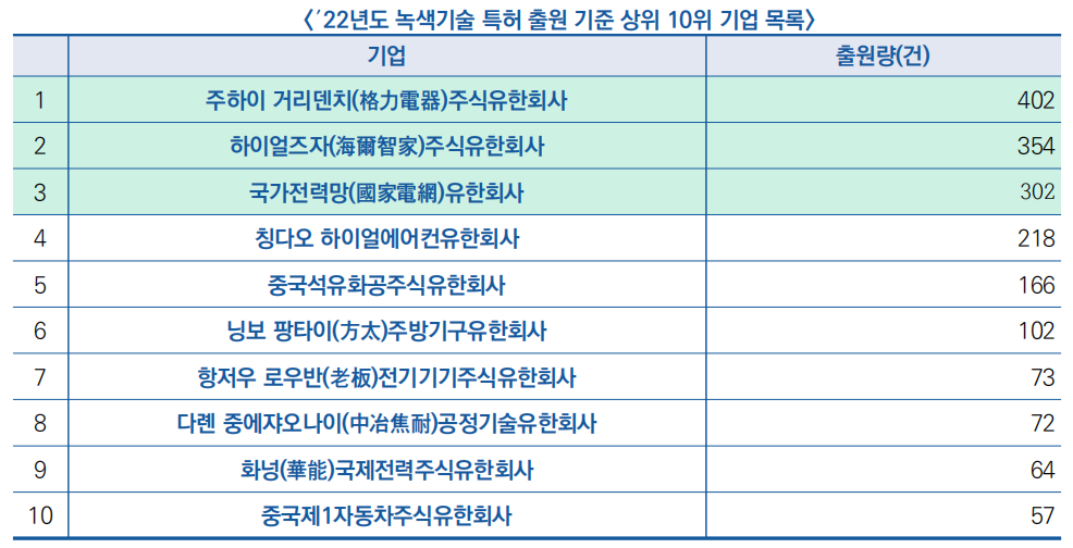 ![]() ![]() 2) 기업별로 보면, ′22년 거리덴치(格力電器)사의 녹색기술 특허 출원은 중국 전체 1위를 차지