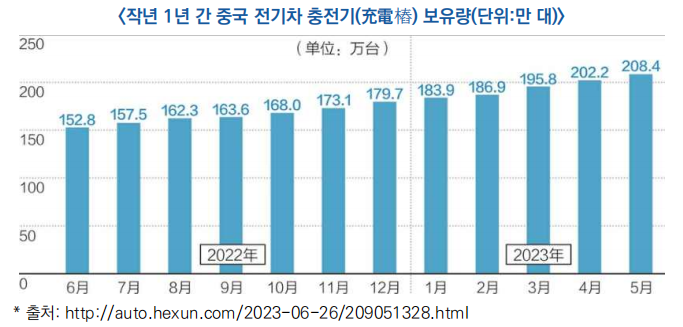 - ′23년 5월 기준 중국 전기차 충전기 수는 총 208.4만 대에 달하며 전년 대비 36% 상승