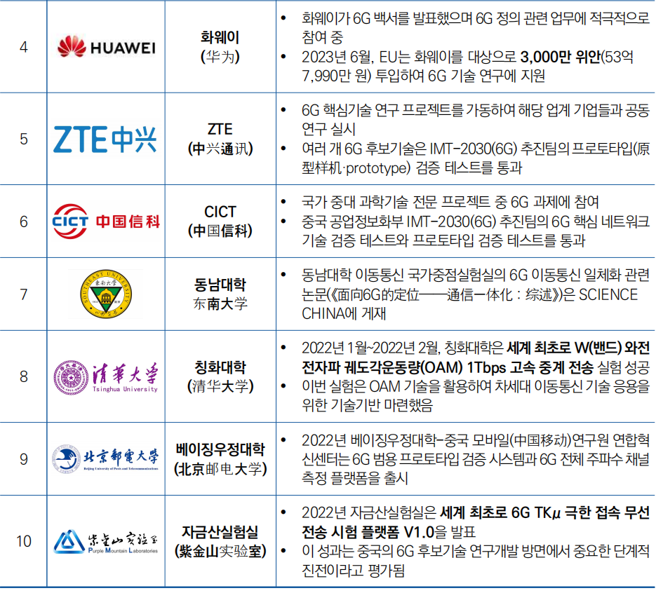 | 중국, 기업별 6G 연구개발 현황 공개 | ||