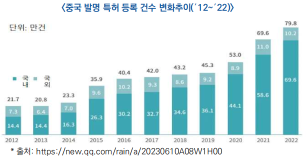 - ′22년 중국 발명특허 등록 건수는 79.8만 건으로 전년 대비 14.7% 증가