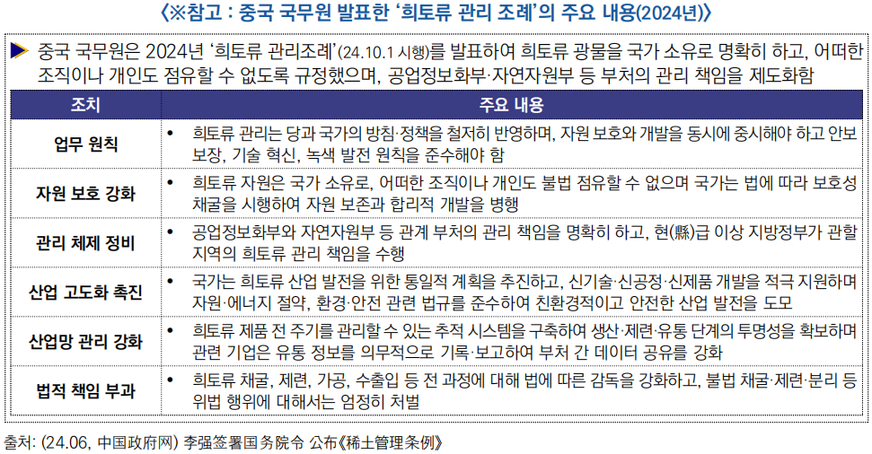 ○ (배경) 중국은 세계 최대의 희토류 매장량(4,400만 톤)과 생산량(세계의 69%)을 보유하고 있으며, 이를 효과적으로 관리하기 위해 2012년 ‘생산계획 관리제도’를 시행한 데 이어, 2024년에는 국무원 ‘희토류 관리조례’를 제정해 국가 차원의 총량조절 체계를 한층 강화