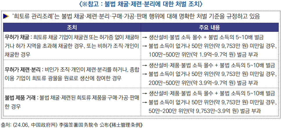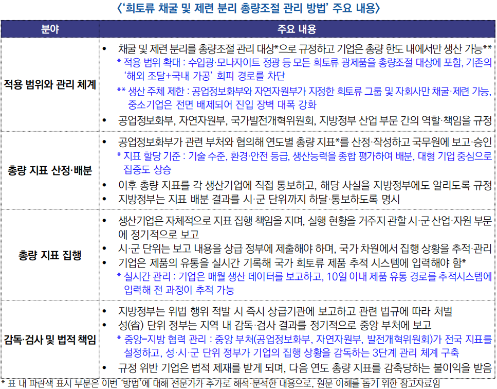 ![]() ○ (내용) 이번 ‘방법’은 ‘회토류 관리조례’에 따른 세부 지침으로, 지표 설정부터 집행·감독·책임까지 전 과정 관리체계를 확립해 전략 광물 관리와 자원 안보를 강화