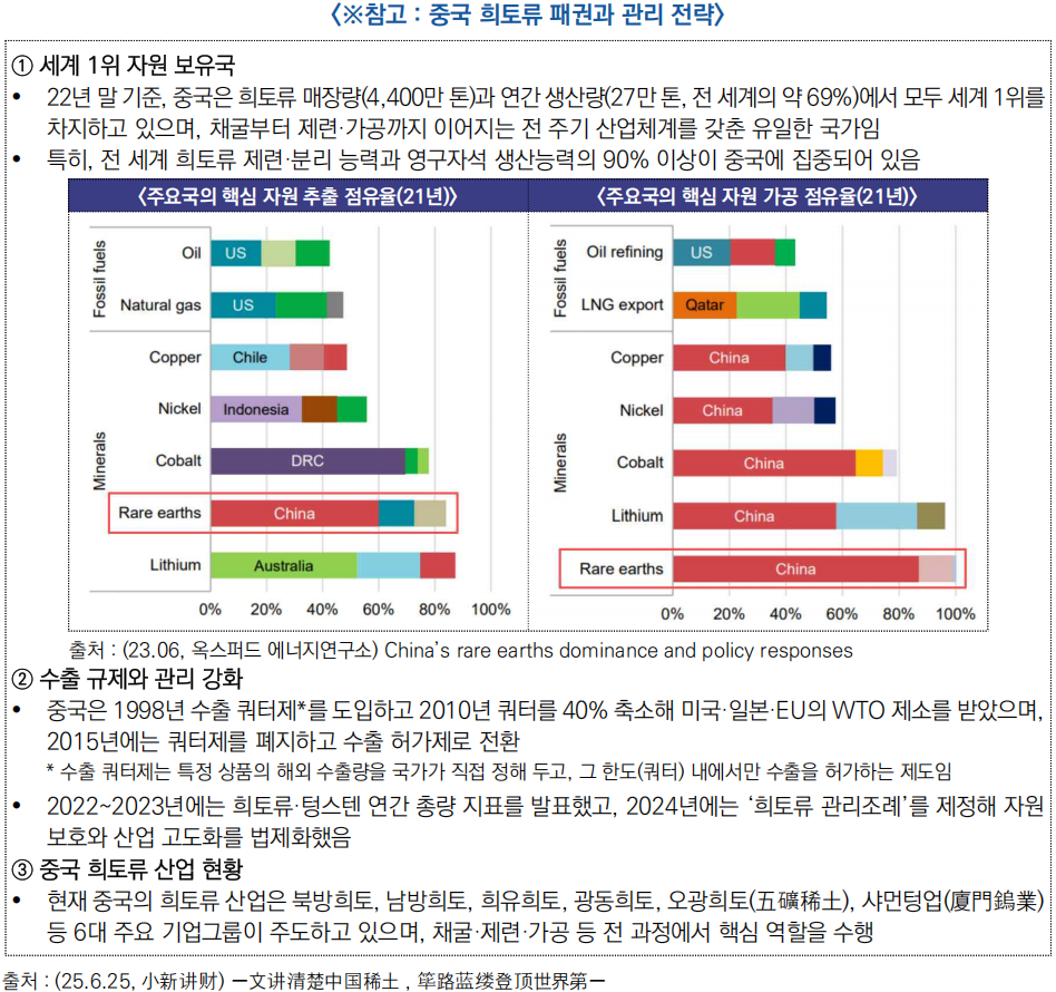 - 희토류는 신에너지, 반도체, 우주항공, 첨단제조 등 전략 산업의 기반 자원으로 ‘산업의 MSG’라 불리며, 중국 경제와 안보의 전략적 자산이자 미·중 협상에서도 중요한 카드로 작용