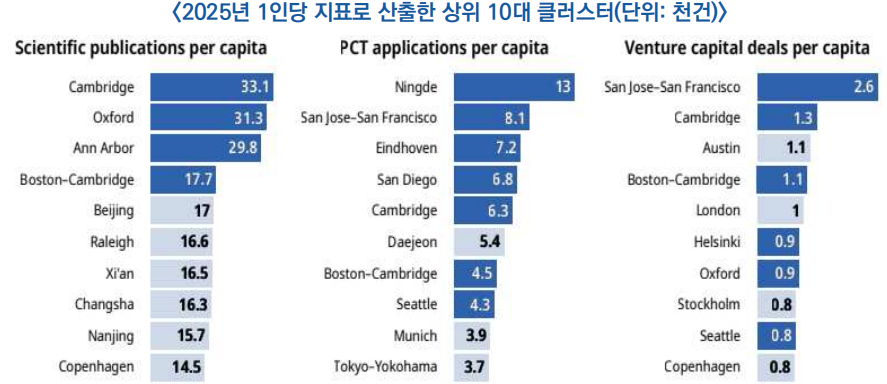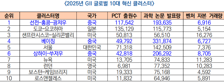 - 이 순위는 ① 국제특허협력조약(PCT) 출원 수 ② 과학 논문 발표 수 ③ 벤처 자본(VC) 거래 건수(2025년부터 신규 반영) 등 세 가지 핵심 지표를 통해 파악
