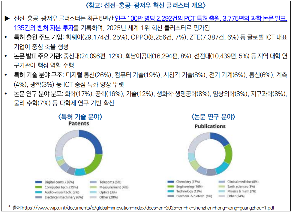 □ 2025년 9월 1일, 세계지식재산권기구(WIPO)가 발표한 글로벌 100대 혁신 클러스터 순위에서, 중국의 선전–홍콩–광저우 클러스터가 도쿄–요코하마 클러스터를 처음으로 제치고 세계 1위에 올랐음