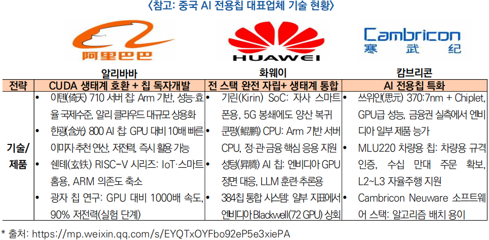 □ 알리바바 사례는 중국이 ‘성숙 공정 + 자국 공급망’을 결합해 글로벌 AI 칩 경쟁에서 ‘탈 엔비디아’ 전략을 구체화하고 있음을 보여줌