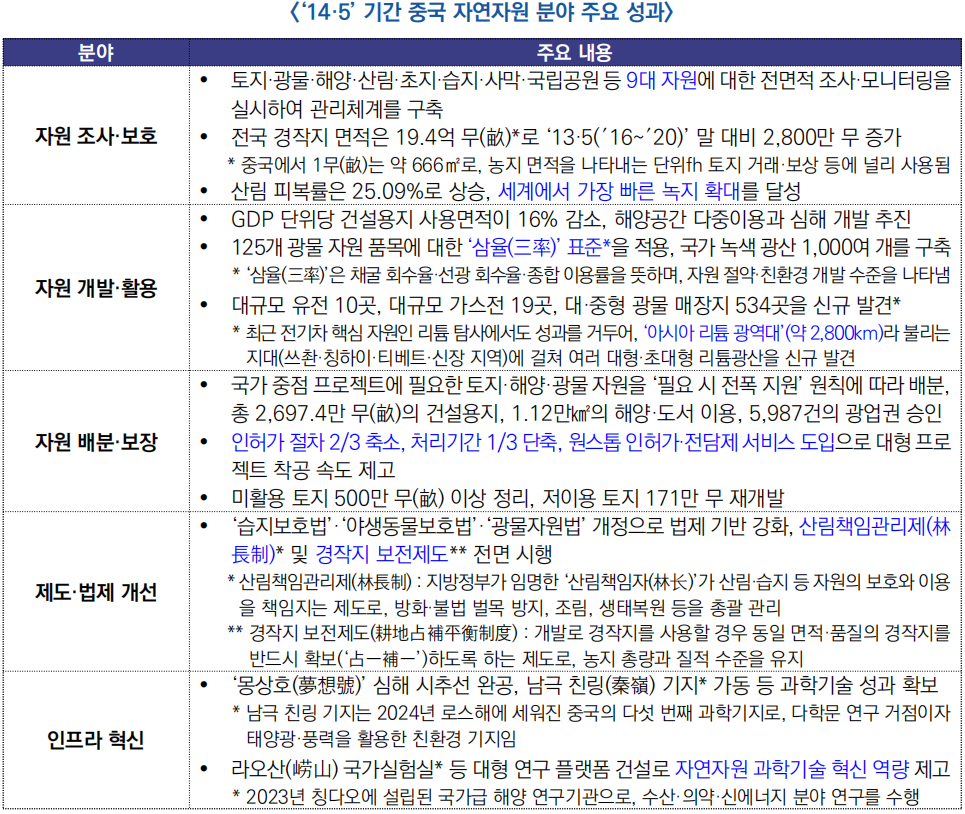 □ 중국 자연자원부가 ‘14차 5개년 계획(′21~25년)’ 성과발표회에서 광물·해양·산림 등 9대 자원 조사와 보호 성과를 바탕으로, 경작지·산림 확대와 자원 개발·배분의 효율성을 강화했다고 발표(25.9.10)