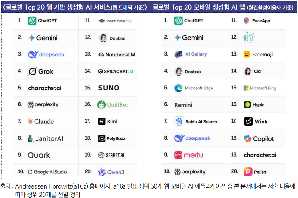 □ Andreessen Horowitz(a16z)는 ‘Top 100 Gen AI Consumer Apps’를 발표하고, 웹 트래픽(Similarweb)과 모바일 월간활성이용자(MAU)를 기준으로 각각 50개 AI 앱을 선정했는데, 중국 기업 DeepSeek가 웹 부문 3위에 올랐음(25.9.4)
