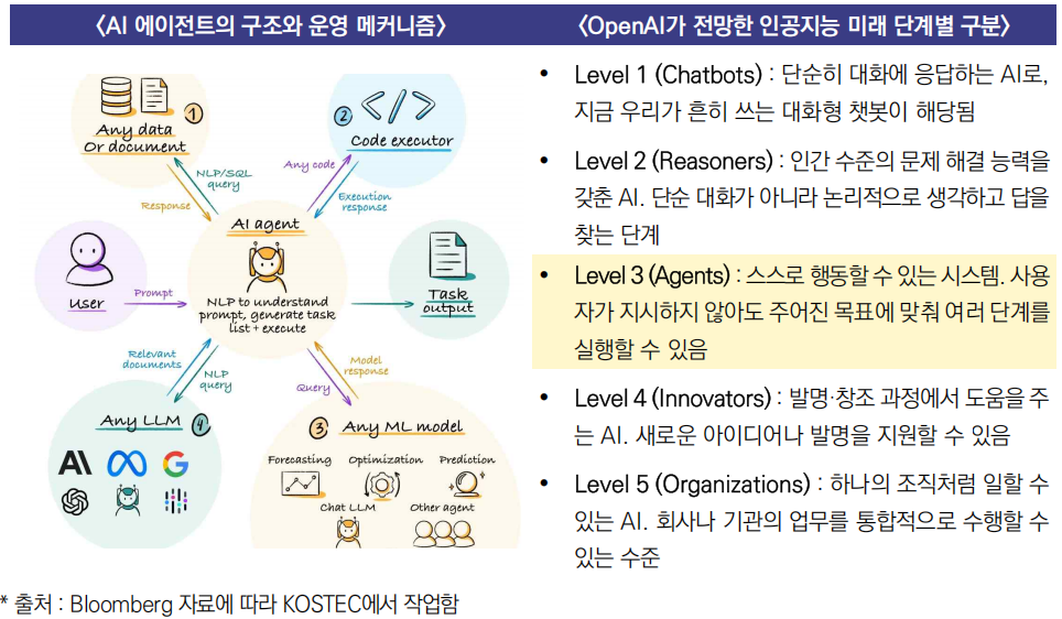 ○ (기술 개요) AI 에이전트는 단순한 대화형 챗봇이 아니라, 사용자를 대신해 데이터 조회, 코드 실행, 다른 AI와의 협업 등을 통해 복잡한 업무를 수행하는 ‘스마트 비서’로 평가됨