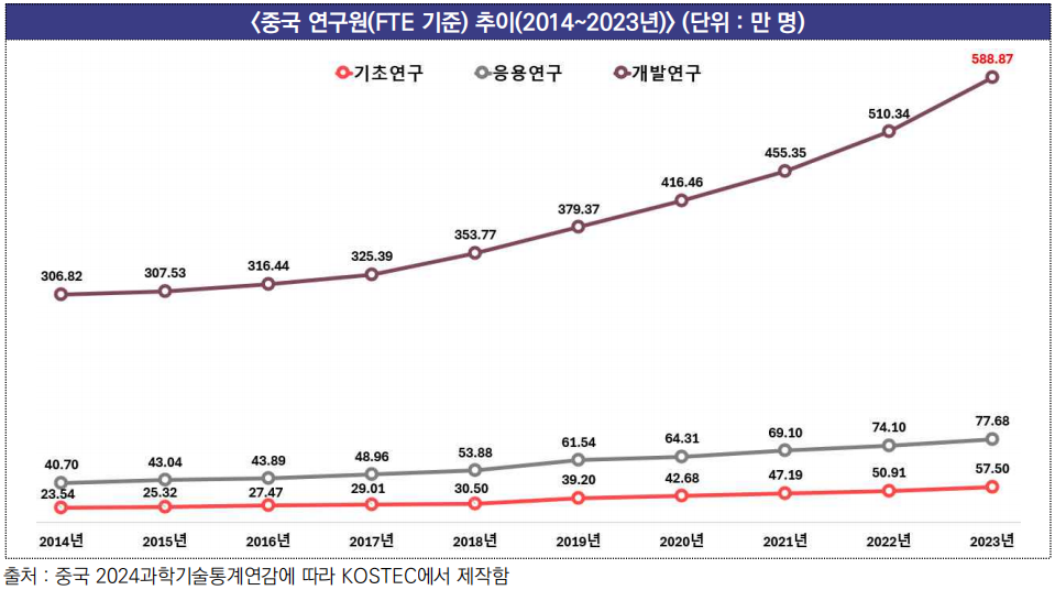 - 특히 개발연구 인력이 2014년 306.82만 명에서 2023년 588.87만 명으로 크게 증가하였으며, 응용연구와 기초연구도 각각 40.70만→77.68만 명, 23.54만→57.50만 명으로 꾸준히 늘어남