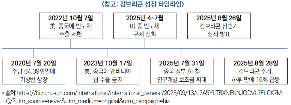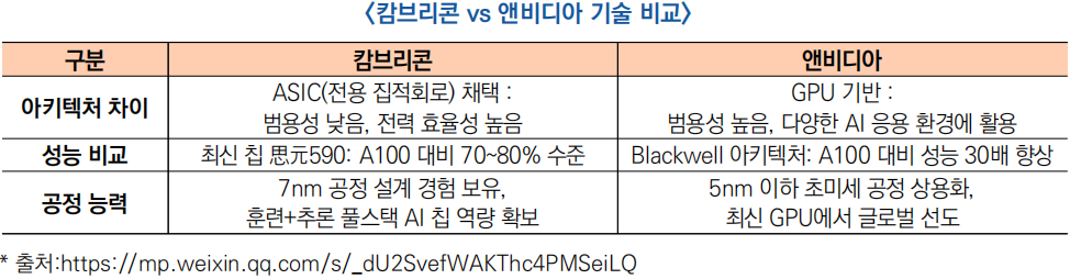- (미국 기술통제와 정책 지원) 미국의 AI 반도체 규제로 앤비디아 칩 공급이 막히면서 국산 AI 칩 수요가 급증했고, 중국 정부의 GPU 국산화와 ‘AI+ 정책’이 캄브리콘의 성장 동력을 강화