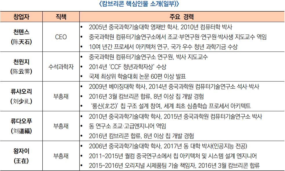 - 핵심인물들은 중국과학원 컴퓨팅연구소가 2008년에 결성한 ‘프로세서 아키텍처와 인공지능 교차 연구팀’(10인 규모) 출신으로 알려져 있음