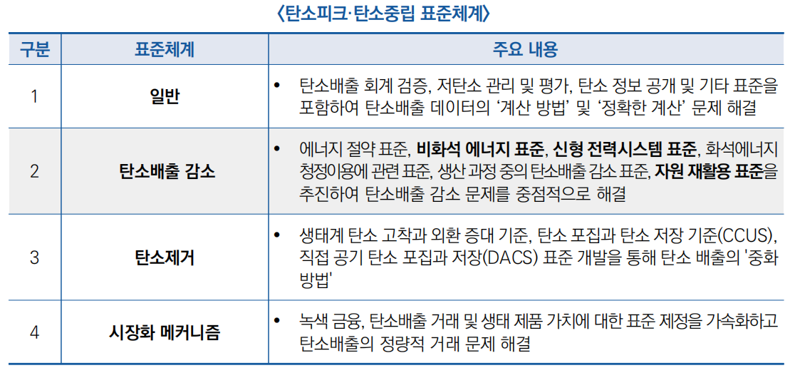 - 탄소피크·탄소중립 국제표준화 업무 촉진을 위한 실무팀을 구성하고 국제 표준 혁신 연구팀 신설을 제안