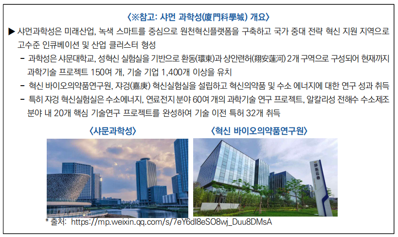 - ‘샤먼과학성(城)’을 통해 국제 수준의 연구개발기관과 대규모 과학 연구 인프라를 건설하고, 샤먼의 독창적이고 선도적인 혁신 제품과 기술 출현