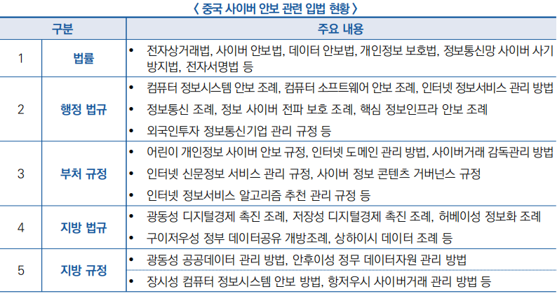 - 최근 10년간 사이버 안보법(′16), 전자상거래법(′18), 데이터 안보법(′21), 개인정보 보호법(′21), 정보통신망 사이버 사기 방지법(′22) 등 5개 전문법을 포함해, 총 140여 건의 법률·법규·규정을 발표