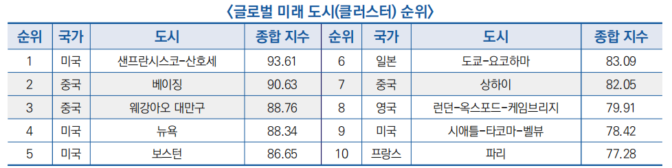 - 베이징은 혁신 선도 기업 수, 유니콘 기업 수, 미래 산업 연간 특허 건수 등 정량적 지표에 따라 종합 지수 90.63점으로 세계 2위를 차지