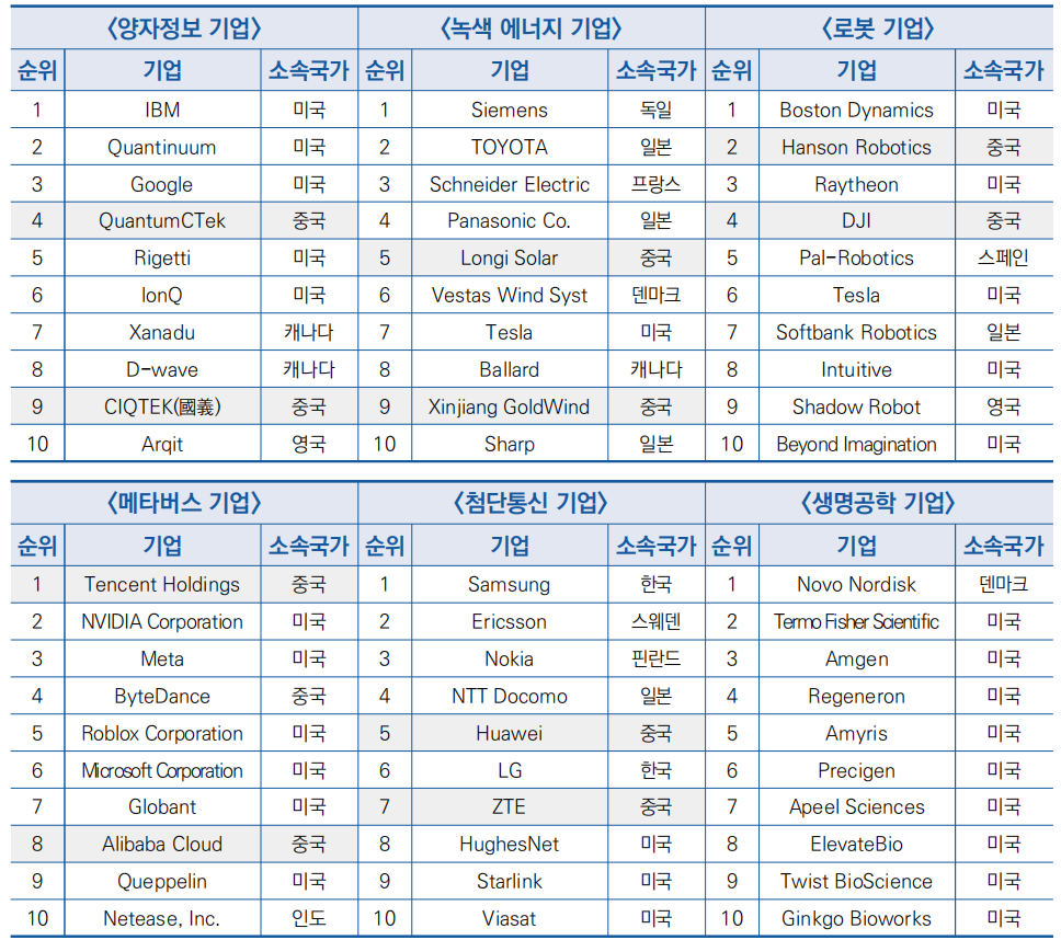 ![]() ○ (6대 분야) 양자 정보, 녹색 에너지, 로봇, 메타버스, 첨단통신, 생명공학 등 분야에서도 10위권에 진입
