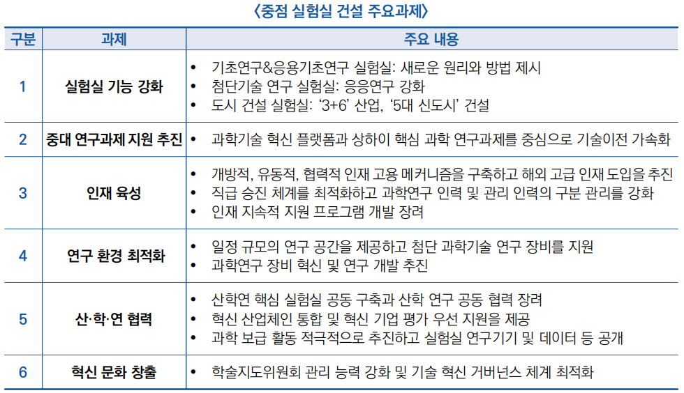 ○ 이번 계획의 주요과제는 ′25년까지 통신 정보, 농업, 에너지, 화학, 생물학, 우주 등 15개 분야에 중점 실험실을 구축하고 기업혁신 및 기술이전 가속화 실현에 있음
