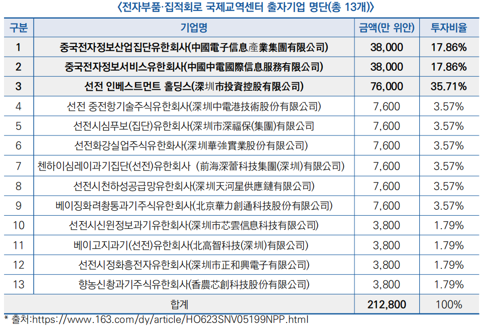 ![]() ○ 국제교역센터는 초기 자본금을 포함하여 통신 장비 제조업체인 중국전자정보산업집단유한회사(CEC) 등 13개 국유기업과 민간기업의 자금으로 운영