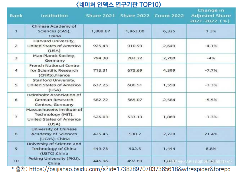 - ′21년 네이처 인덱스 기준, 전 세계 자연과학 분야 국가연구기관 중 중국과학원이 연속 10년 1위를 차지하였고, 하버드대학, 막스플랑크연구소가 각각 2~3위에 해당