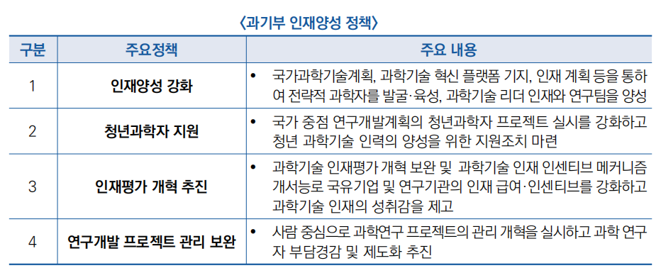 - 과학기술부는 다양한 지원조치를 통해 기초연구, 응용기초연구, 기술 혁신, 성과 이전, 산업화의 전체 과정에서 기업의 주도적 지위를 강조