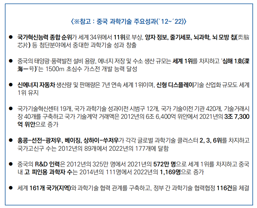- 과기부는 과학기술 자립·자강 목표 달성을 위한 2023년 당조1호 문건(黨組一號文件)을 제정