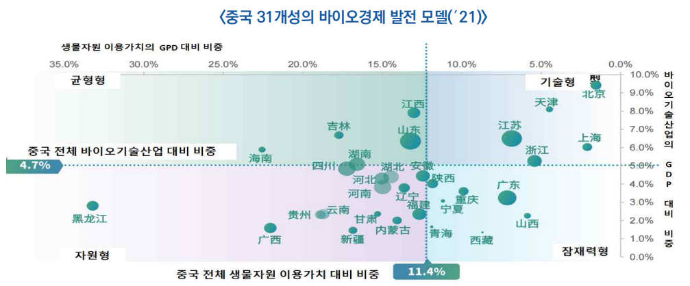 - 바이오기술산업의 비중을 보면 베이징, 상하이, 톈진 순으로 높고, 생물자원 이용가치 비중을 보면 광시, 헤이룽장, 신장 순으로 높음