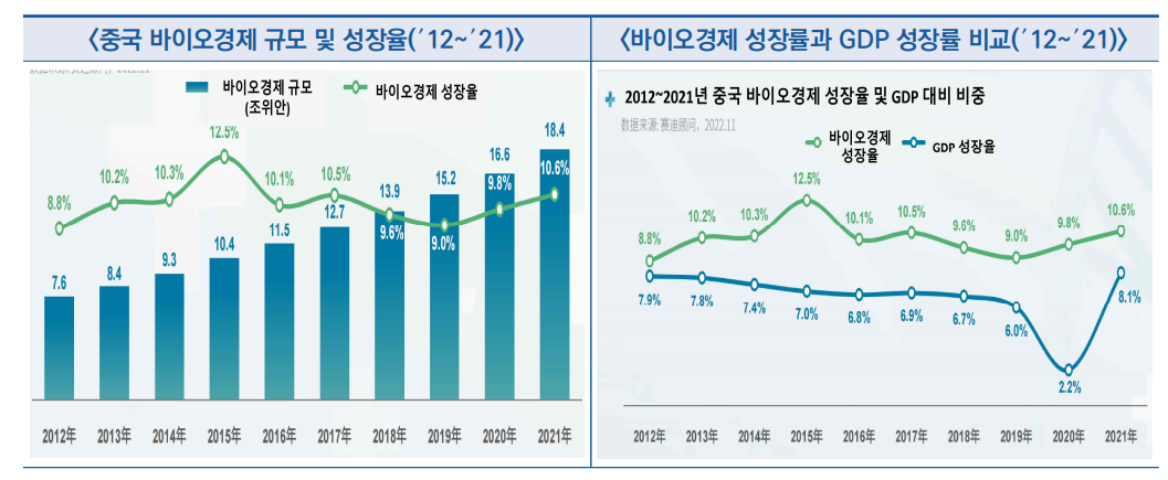 ○ 지난 10년(′12~′21)간 중국의 바이오경제 규모는 7.6조 위안에서 18조 4000억 위안으로 증가하고, 연평균 성장률은 GDP 성장률 보다 높은 10%를 초과