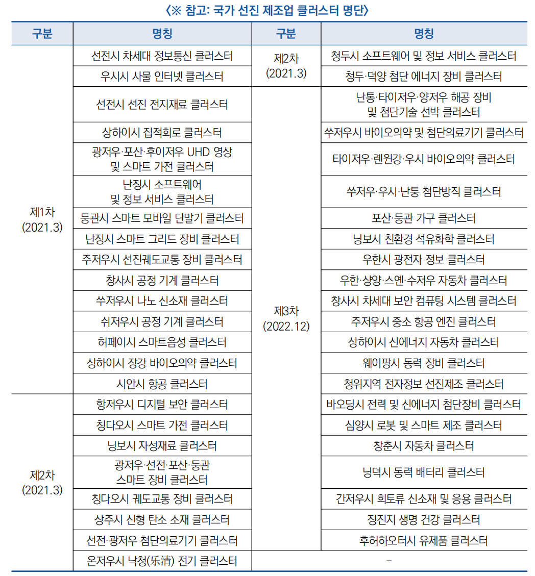- ′21년 3월에 중국 공업정보화부는 제 1,2차 선진제조업 클러스터(25개) 명단을 발표했고 올해 제 3차 선진제조업 클러스터(20개)를 선정하여 총 45개에 달함