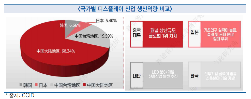 - 현재 세계 신형 디스플레이산업은 주로 한국, 일본, 대만과 중국에 집중하여 그 중 중국의 FTF-LCD 생산역량이 세계 1위로 전체의 68.34% 차지