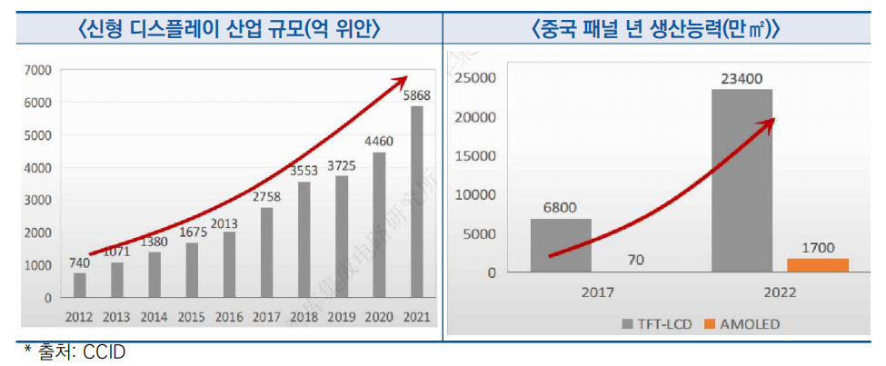 ![]() - ′21년 기준 중국의 신형 디스플레이 산업 규모는 5,865억 위안(108조 2,796억 원)이며 2012~2021년 연평균복합성장률은 25.8%임