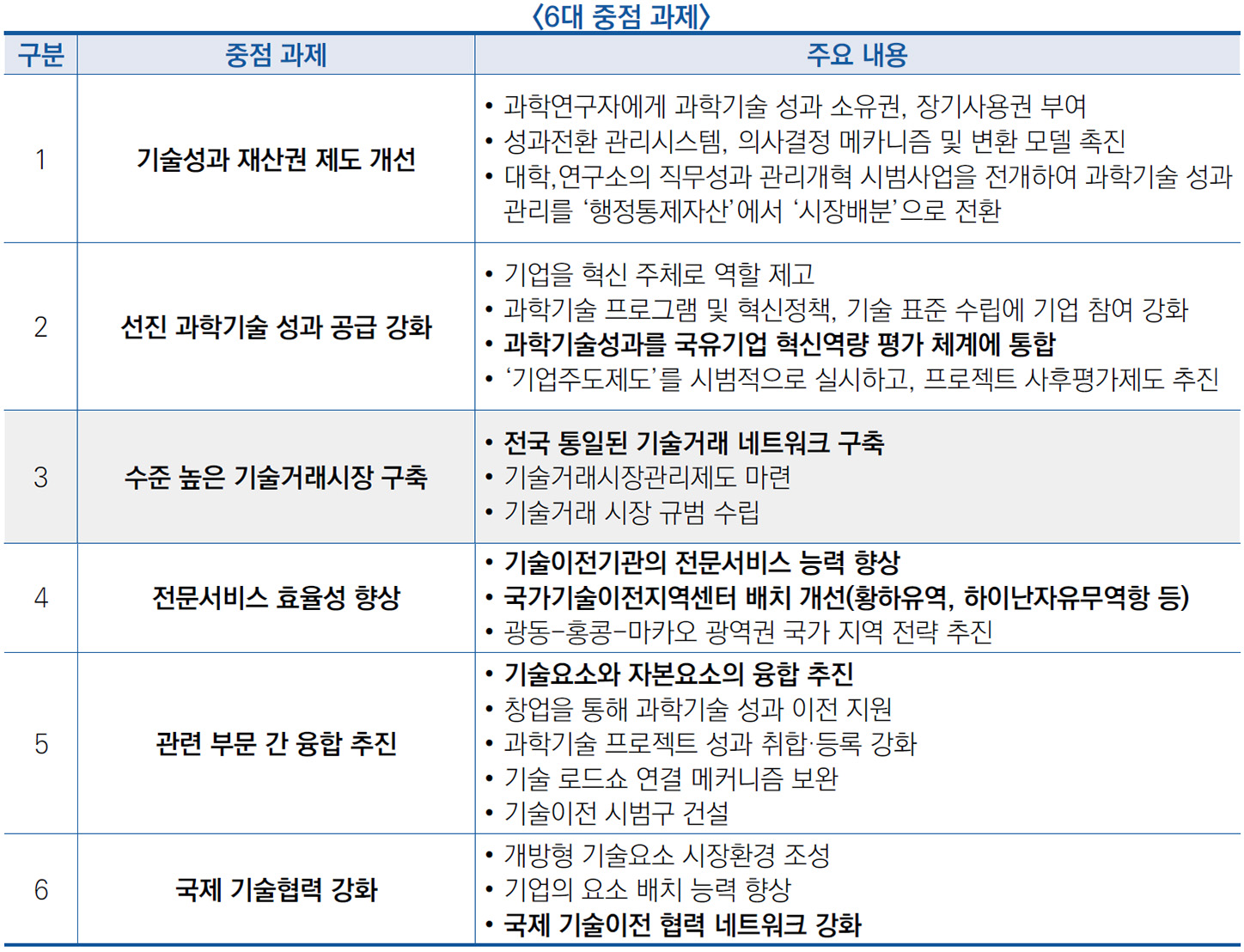 ○ 6대 중점 과제로 기술성과 재산권 제도 개선, 선진 과학기술 성과 공급 강화, 수준 높은 기술거래시장 구축, 전문화 서비스 효율 향상, 관련 부문 간 융합 추진, 국제 기술협력 강화 등을 포함