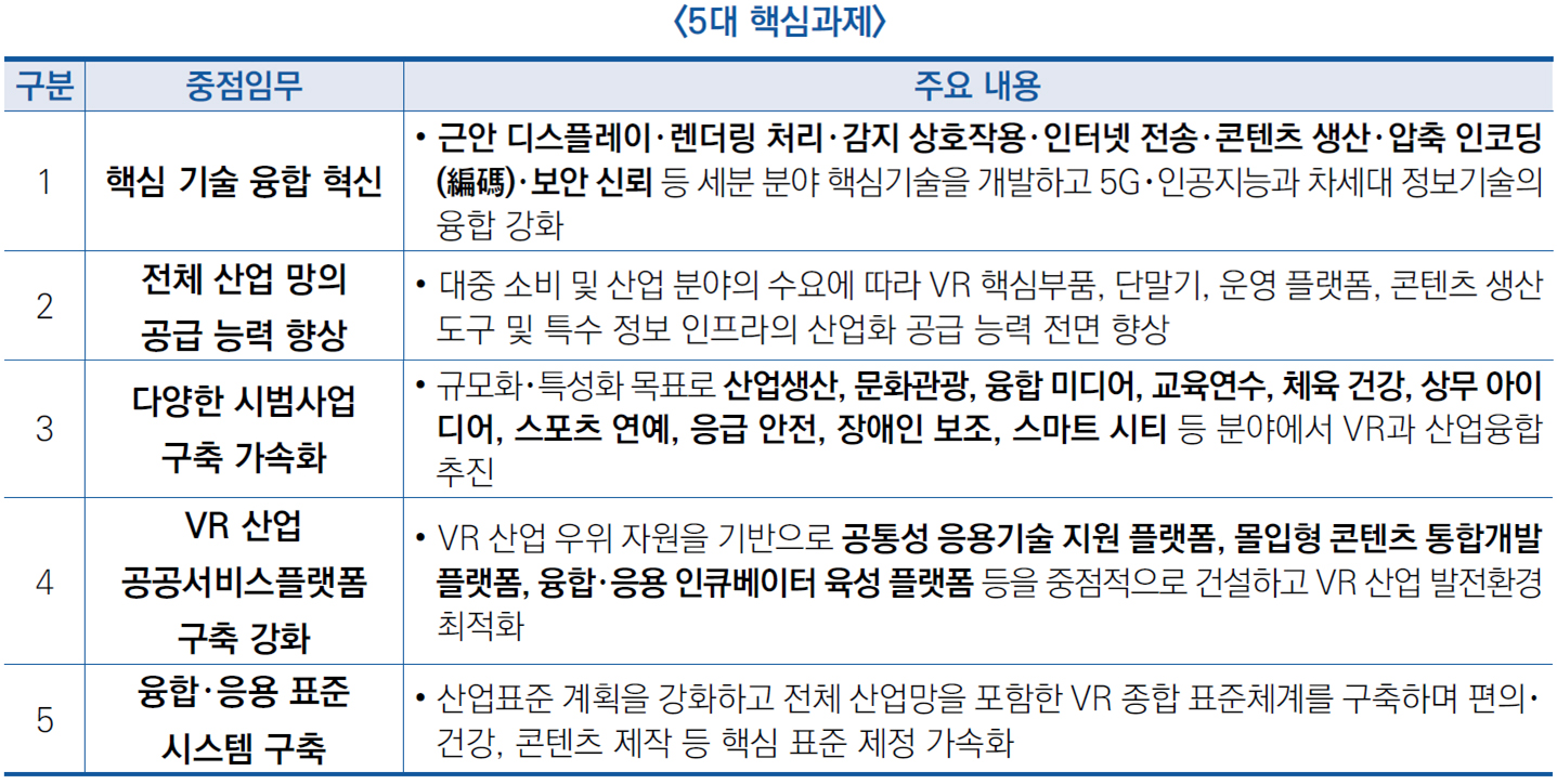 ○ 주요 내용으로 핵심 기술 융합 혁신 추진, 전체 산업 망의 공급 능력 향상, 다양한 시범사업 구축 가속화, VR 산업 공공서비스플랫폼 구축 강화, 융합・응용 표준 시스템 구축 등 5대 핵심 과제 제시